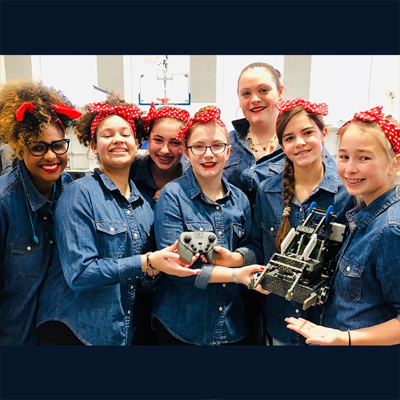OMG too easy! Last year was my school’s second year in competitive robotics. I was so excited to have gone from 10 participants to 29! As I was forming teams, I had a group of sassy girls tell me they wanted to be an all-girls team. Of course, that has always been my dream! However, these girls did not want to compete in FLL like the boys. I tasked them with the job of finding a competition to go to and they came back with the VEX IQ Challenge. I knew nothing about VEX, had no equipment, and no money for equipment. These tenacious girls were determined. I reached out to a Maryland coach I found online, Tim Krispin, and he was so excited to hear that I some girls who wanted to join VEX. It was late October. He skyped them and told them all of the VEX IQ Challenge info. After that video call, I told him that I couldn’t afford to get their equipment, and he sent me the link for the Girl Powered grant. I applied, thinking it was a total shot in the dark, and we got it! It was that grant that made The Riveters possible. Those girls started very late in the season, made it to Worlds and gave me the proudest moment of my 15 years teaching. They not only changed the face of STEM for our little school, but the VEX Robotics World Championship inspired them to provide STEM opportunities to girls in the area surrounding our school.Recognizing that our school is sandwiched between four low income housing projects, they devised a plan to bring VEX Robotics to the girls there. The Girl Powered grant taught them that grants can make a huge difference. We applied for a grant through the Chaney Foundation and just received the funds to purchase 12 VEX kits to offer free STEM nights to those communities. The Girl Powered Initiative took a group of eight young women and turned them into eight female STEM advocates. They tell people all the time they are The Riveters because Rosie the Riveter was used to recruit females for a male dominated industry. Our drivers wear red lipstick because of an article they read while learning about Rosie. “The first and most famous manifestation of red lipstick was in fact in New York when the suffragettes took to the streets, banded together, and as part of their defiance and fight for the vote, they all wore bright red lipstick.” They viewed Rosie red lips as an act of defiance against male stereotypes. Seeing their growth and hearing them educate other young women is such a beautiful thing! This has to be the most positive experience I have had in a LONG TIME!